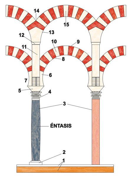 3.- El fuste es la parte central de la columna, entre el capitel y la basa. Posee forma cilíndrica y se realiza principalmente en mármol o bien piedra. Del mismo modo, los fustes presentan un ensanchamiento en su parte central denominado éntasis. En el caso de la Mezquita fundacional, estos son reutilizados de otros templos romanos y visigodos principalmente; posteriormente ya se realizarán ex profeso alternando tonalidades azules y rosas.