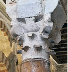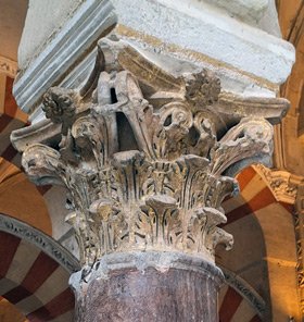 4.- El capitel es un elemento funcional y decorativo situado en la parte superior del fuste, y por tanto pertenece al orden de la columna. En la Mezquita su tipología varía desde los visigodos, romanos de orden compuesto y corintio hasta los de trépano y pencas propiamente hispano musulmán.