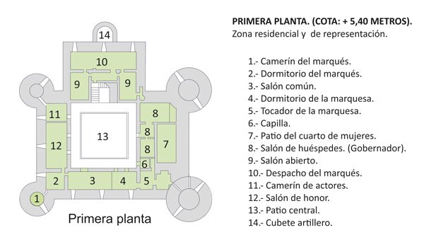 El patio central presenta dos niveles o galerías, constituyendo como espacio vertebrador de las diferentes estancias del castillo. La galería inferior se conforma a través de arcos de medio punto sobre columnas con capiteles corintios, realizadas en piedra caliza de la zona y decorada con motivos ornamentales propios del Renacimiento. La galería superior por el contrario, está realizada en mármol de Carrara, traídas ex profeso desde Italia vía marítima a Cartagena, y de allí, por caminos en carretas hasta el Castillo. Destaca la esplendida balaustra en mármol que circunda la galería alta del patio.