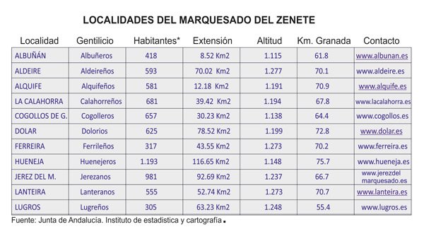 El Marquesado del Zenete posee una superficie total de 59.749 hectáreas y una población global de 7.515 habitantes repartidos entre las once poblaciones que lo conforman: Albuñán, Aldeire, Alquife, La Calahorra, Cogollos de Guadix, Dólar, Ferreira, Huéneja, Jeres del Marquesado, Lanteira y Lugros.