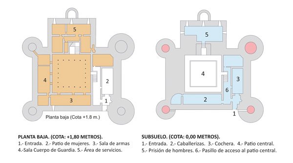 Se trata de un castillo de planta cuadrangular cuyas estancias se distribuyen a través de un patio central con cuatro torres cilíndricas de carácter defensivo en sus esquinas. En la fachada oeste del mismo se adosa finalmente una estructura rectangular al que se construye un cubete artillero.