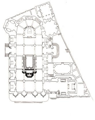 -El coro, situado en relación directa con el espacio litúrgico, constituyó otro ámbito de especial relevancia representativa. Su disposición respondía tanto a las necesidades del rezo coral como a la escenificación del orden capitular, reforzando la estructura jerárquica interna de la catedral. En torno a él se organizaban las principales ceremonias, integrando arquitectura, liturgia y poder simbólico.